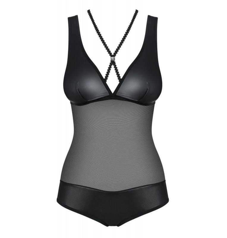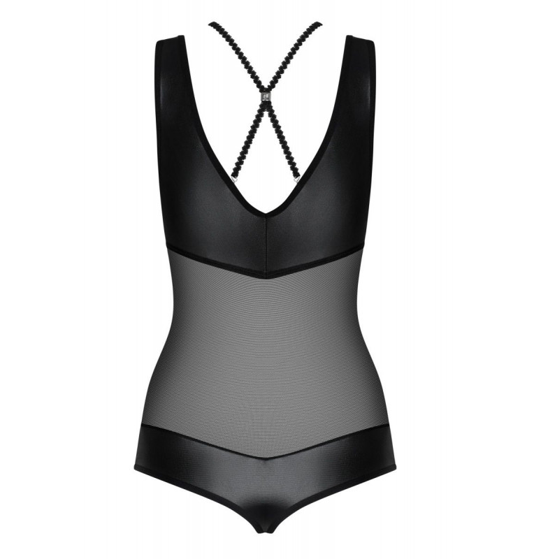 Соблазнительное боди Leatheria выполнено из эластичной эко-кожи и полупрозрачного тюля. Лиф мягкий без косточек, широкие бретели не регулируются. На спинке и в области груди изделие декорировано мягкими лентами.