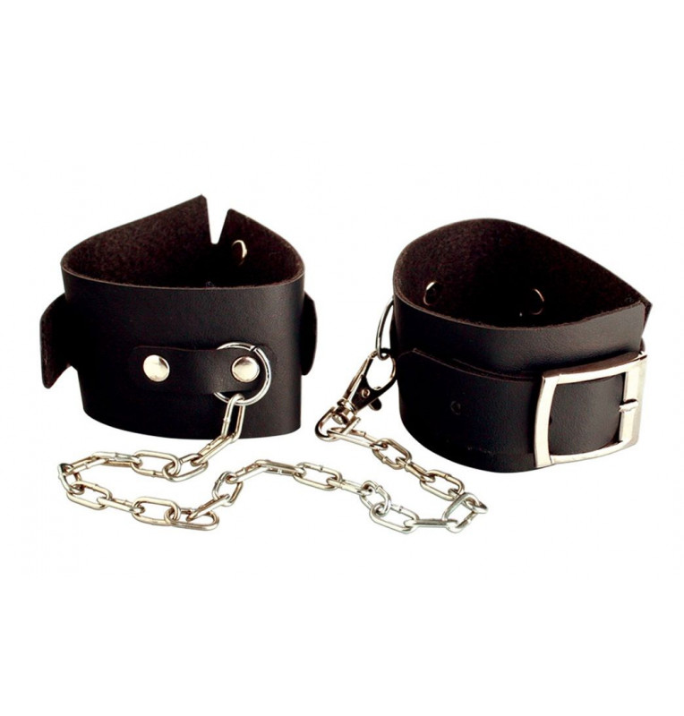 Наручники регулируются с помощью ремешка и соединены между собой металлической цепочкой.