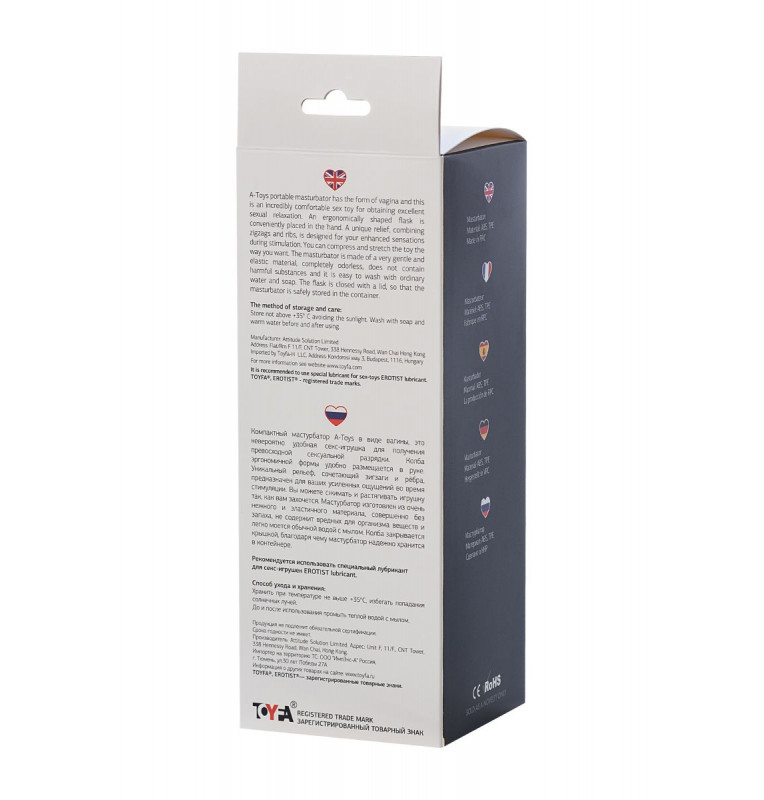 Компактный мастурбатор A-Toys в виде вагины — это невероятно удобная секс-игрушка для получения превосходной сексуальной разрядки. Колба эргономичной формы удобно размещается в руке. Уникальный рельеф, сочетающий зигзаги и рёбра, предназначен для ваших усиленных ощущений во время стимуляции. Вы можете сжимать и растягивать игрушку так, как вам захочется. Мастурбатор изготовлен из очень нежного и эластичного материала, совершенно без запаха, не содержит вредных для организма веществ и легко моется обычной водой с мылом. Колба закрывается крышкой, благодаря чему мастурбатор надёжно хранится в контейнере.