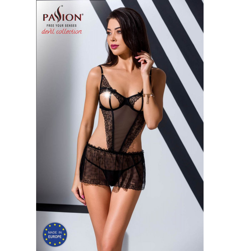 Соблазнительная сорочка Esmeralda выполнена из эластичного тюля. Лиф открытый на косточках. Бретельки и застежка на спинке регулируются. В комплекте: сорочка и трусики-стринги.