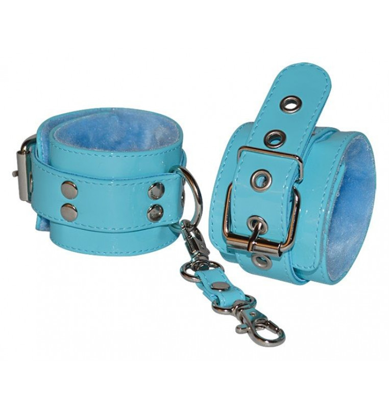 Яркие наручники из искусственной лаковой кожи голубого цвета. Внутренняя сторона изделия отделана мягким искусственным мехом. Соединяются наручники при помощи перемычки с двумя карабинами. Длина манжет - 30 см. Ширина - 5,5 см.