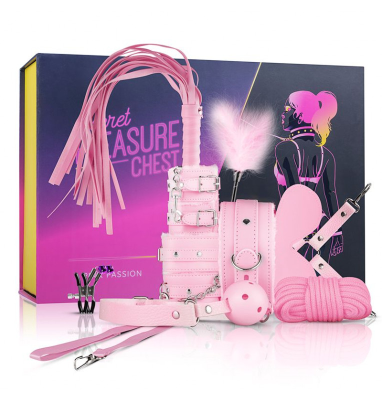 Розовый эротический набор Pink Pleasure. В комплекте плеть, оковы, наручники, ошейник, крестообразный соединитель, поводок, зажимы на соски, веревка (5 метров), кляп, маска на глаза, щекоталка.