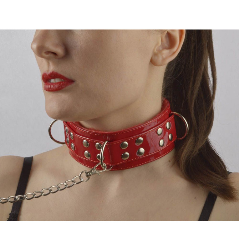Ошейник предназначен для создания эротичного образа в ролевых играх, а также позволит управлять партнёром при помощи поводка. Ошейник изготовлен из лаковой искусственной кожи. В качестве подкладки используется искусственный мех, мягкий и приятный на ощупь. Регулируется ошейник при помощи кнопок. Фурнитура имеет никелевое покрытие. В комплекте с ошейником идет поводок в виде цепочки с карабином и петлёй из искусственной кожи, для запястья. Длина поводка-цепочки - 100 см.
