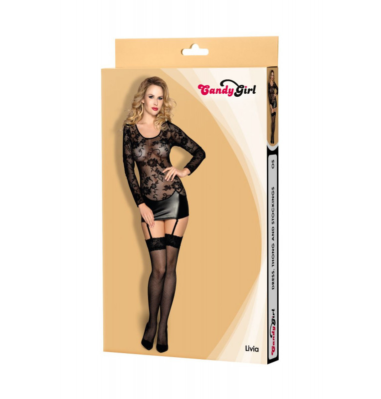 Эффектное эластичное платье Livia с длинными рукавами представит фигуру в выгодном свете, зрительно удлинив ее и подчеркнув стройность. Юбка-wetlook экстремально короткой длины привлечет внимание к бедрам и ягодицам. Съемные регулируемые пажи в паре с чулками обеспечат идеальное прилегание и натяжение. Образ дополняют чулки в сетку с широкой кружевной резинкой без силикона, с усиленным мыском, и Т-стринги с ластовицей. В комплекте: платье, чулки, трусики-стринги.
