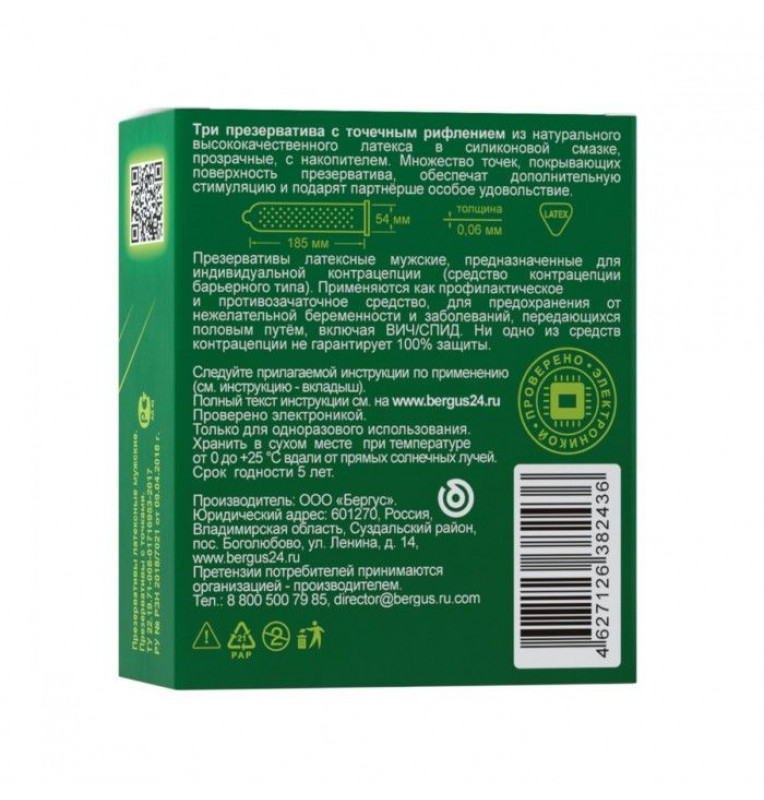 Презервативы с точками – один из самых популярных видов. Они не только защищают от ЗППП и нежелательной беременности, но и дополнительно стимулируют партнёршу во время секса. Производятся из натурального латекса. Добавляемый лубрикант выполнен на силиконовой основе и является гипоаллергенным. В упаковке - 3 шт. Номинальная ширина - 54 мм. Толщина стенки - 0,06 мм.