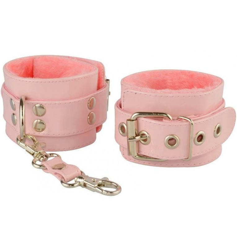 Нежные наручники из искусственной лаковой кожи. Внутренняя сторона изделия отделана мягким искусственным мехом. Соединяются наручники при помощи перемычки с двумя карабинами. Ширина - 5,5 см.