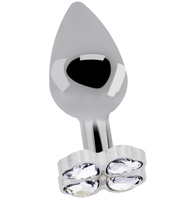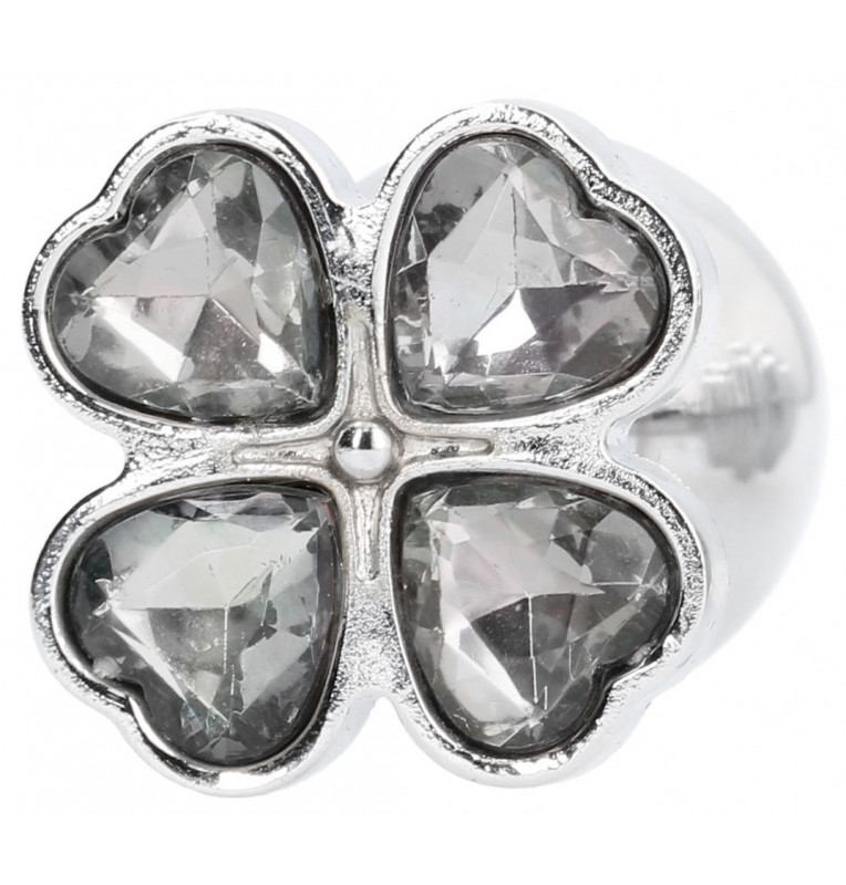 Серебристая анальная пробка с прозрачными кристаллами в форме клевера - 8,2 см.