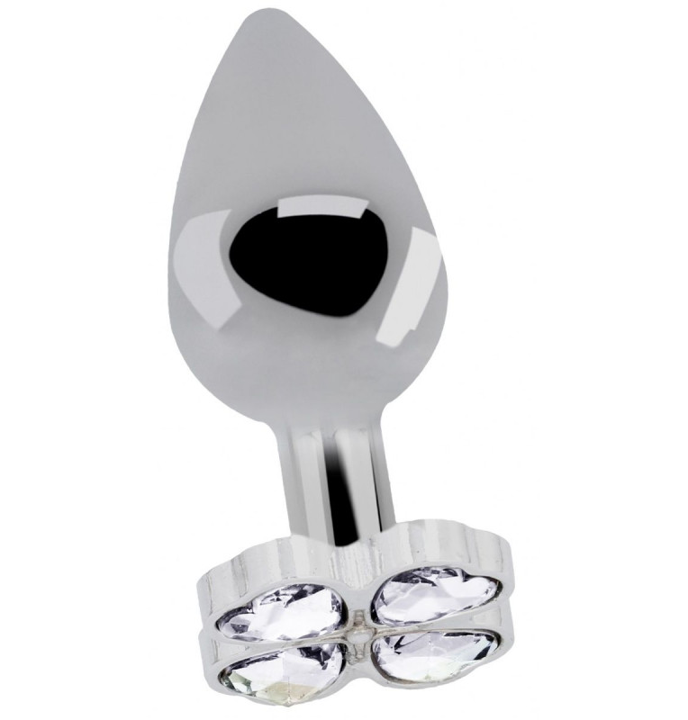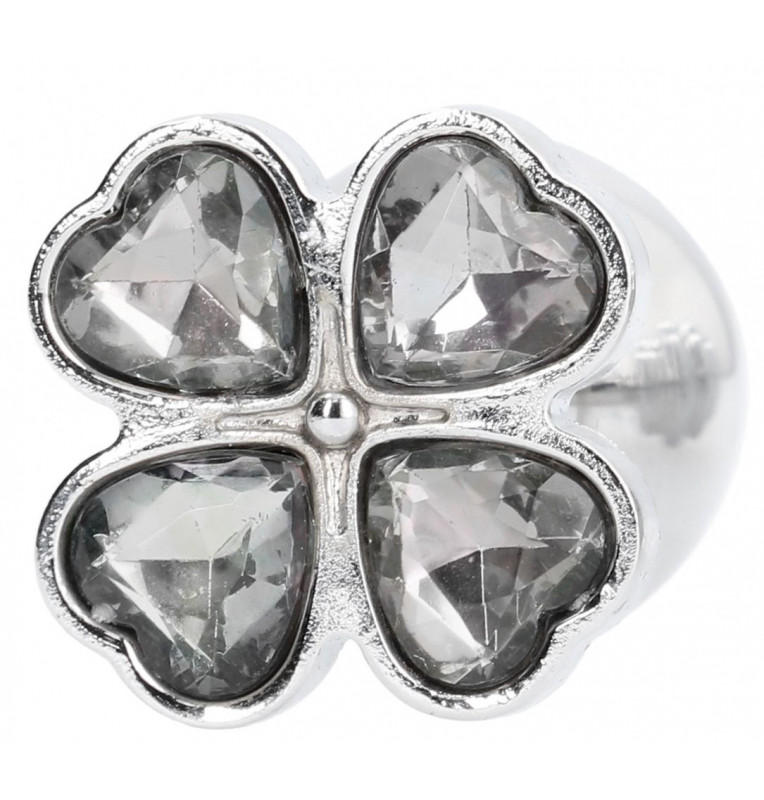 Серебристая анальная пробка с прозрачными кристаллами в форме клевера - 9,5 см.
