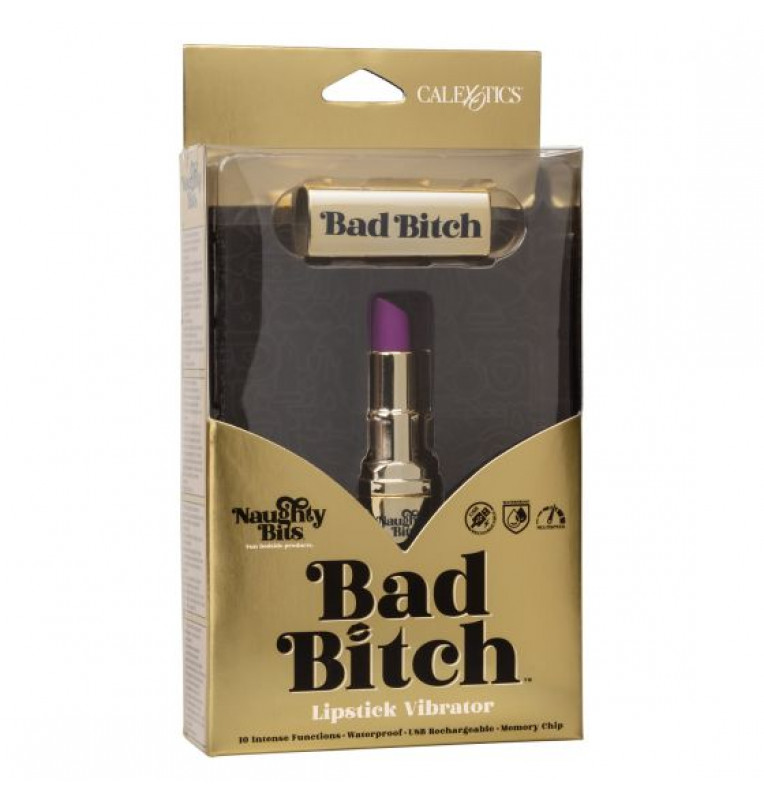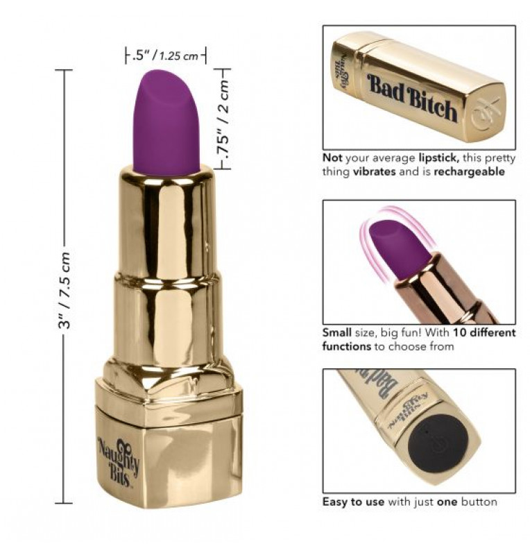 Naughty Bits Bad Bitch Lipstick – перезаряжаемый мультискоростной миниатюрный вибромассажер, выполненный в виде помады. Мощный и бесшумный вольфрамовый мотор обеспечивает 10 различных функций вибрации, пульсации и эскалации. Компактность, удобство и нейтральная форма делают этот вибромассажер идеальным спутником везде, куда бы ты ни отправилась. Сам вибромассажер изготовлен из блестящего золотого АБС-пластика, а головка - из мягкого ультраплюшевого силикона, обеспечивающего приятные и гарантировано безопасные тактильные ощущения. Игрушка имеет удобное управление одной кнопкой. Чтобы включить или выключить игрушку, необходимо нажать и в течение трех секунд удерживать кнопку питания. Вибромассажер заряжается через USB и может быть подключен практически в любом месте, просто подсоедините идущий в комплекте шнур к совместимому порту компьютера или USB-адаптера (приобретается отдельно), а противоположный конец со штекером к игрушке. Длина мягкого кончика - 2 см., диаметр - 1,25 см. Время зарядки - 2 часа. Время работы - 2 часа.