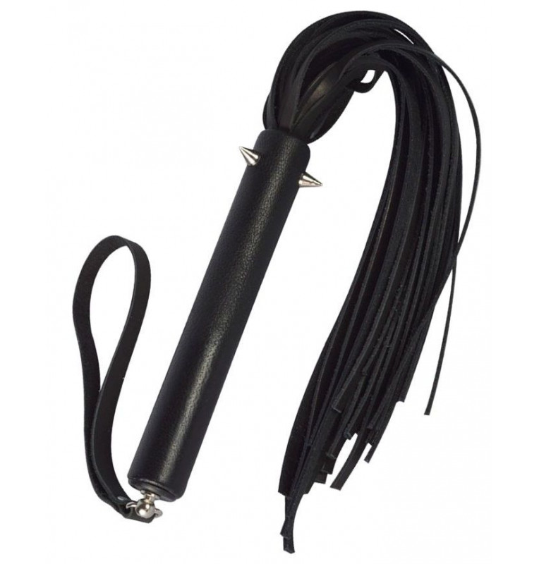 Плеть из натуральной кожи. Рукоять обтянута кожей и украшена металлическими шипами. Длина рукояти - 15 см. Длина хвостов - 25 см., ширина - 1 см.