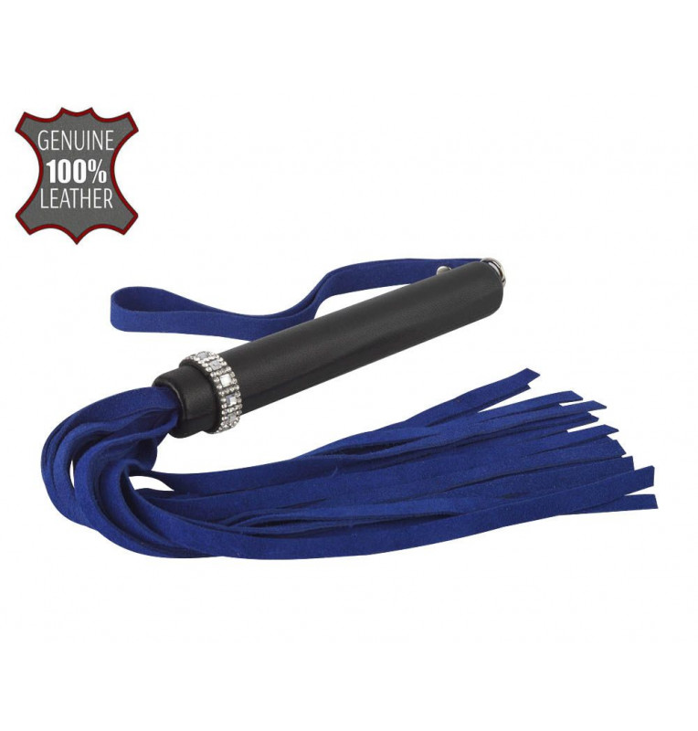 Плеть Гламур полностью изготовлена из натуральной велюровой кожи. Рукоять украшена стразами. Для удобного использования на торце ручки имеется ремешок. Длина рукояти – 15 см.