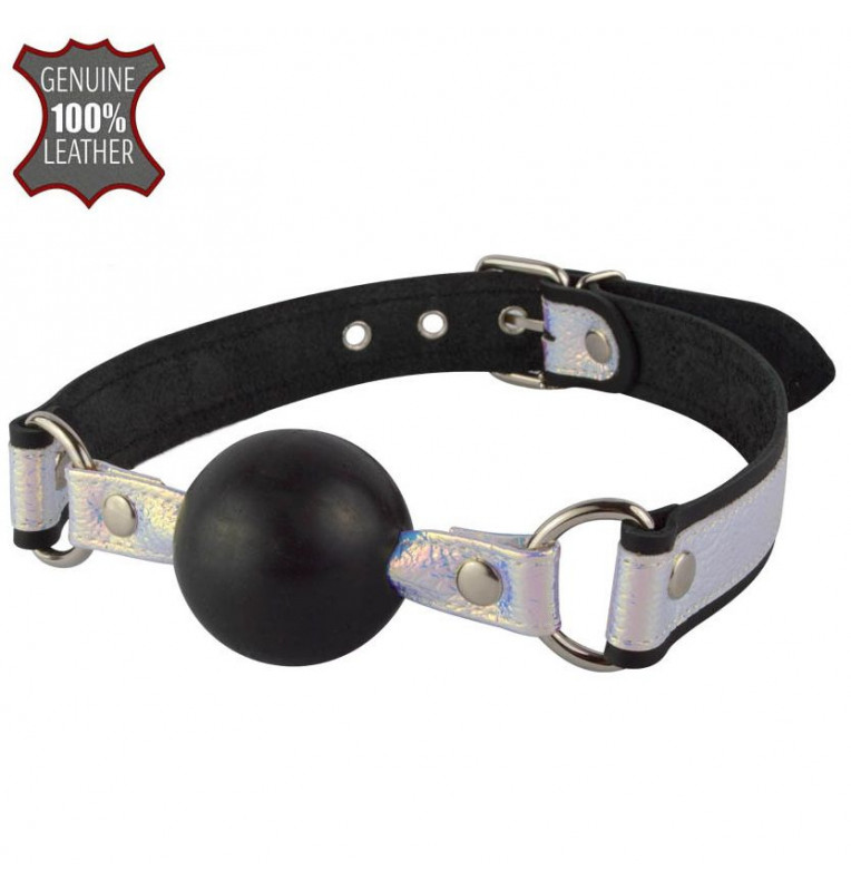 Эффектный девайс от Ситабелла в виде сферического кляпа с яркими ремешками из натуральной высококачественной кожи чёрного цвета, сделает ролевые игры особенно страстными и запоминающимися. Ремешки кляпа декорированы голографическими вставками. Кляп «хамелеон», сделает Ваш образ неповторимым и сексуальным, ведь так красиво Вам ещё не закрывали рот! Легко зафиксировать девайс на шее и отрегулировать размер можно при помощи пряжки. Вся используемая фурнитура имеет хромированное покрытие. Длина ремешков - 57 см., ширина - 2,5 см. Диаметр шара - 4,5 см.