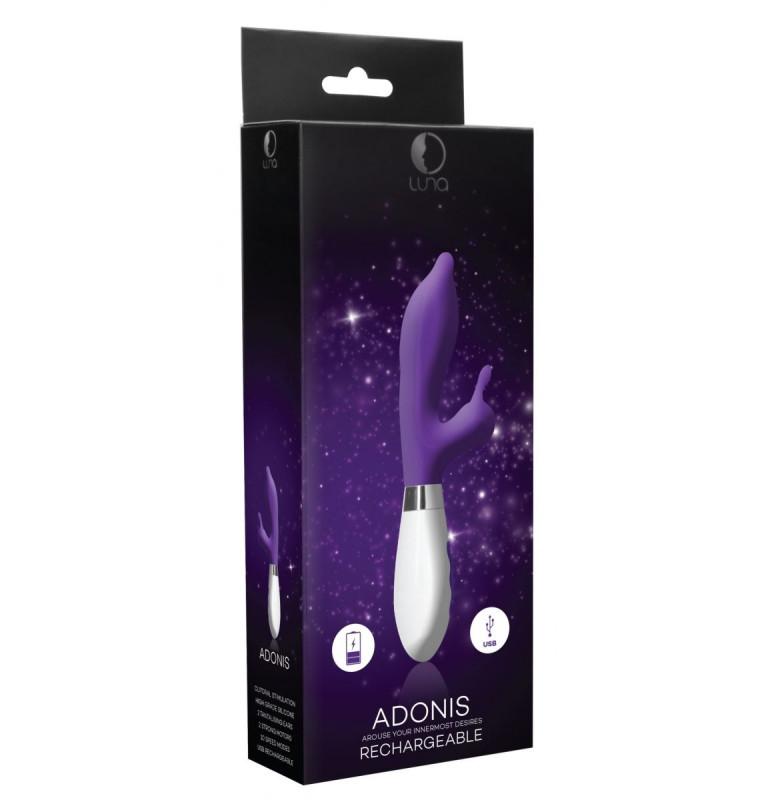 Adonis – вибромассажер кролик. Эта игрушка имеет особую эргономичную форму с маленьким округлым выступающим кончиком, и гибкий клиторальный отросток с усиком, что делает стимуляцию более концентрированной. Вибромассажер имеет два мощных двигателя, по одному в каждом отростке, обеспечивающих 10 функций вибрации, способной достигать на вагинальном стволе 15000 и на клиторальном отростке 5200 оборотов в минуту, при этом уровень звука не превышает 50 дБ. Вибромассажер заряжается через USB и может быть подключен практически в любом месте. Просто подсоедините идущий в комплекте шнур к совместимому порту компьютера или USB-адаптера (приобретается отдельно), а противоположный конец со штекером к игрушке. Полная зарядка занимает 30 минут, ее достаточно для беспрерывной работы до 60 минут. Рабочая длина - 12 см.