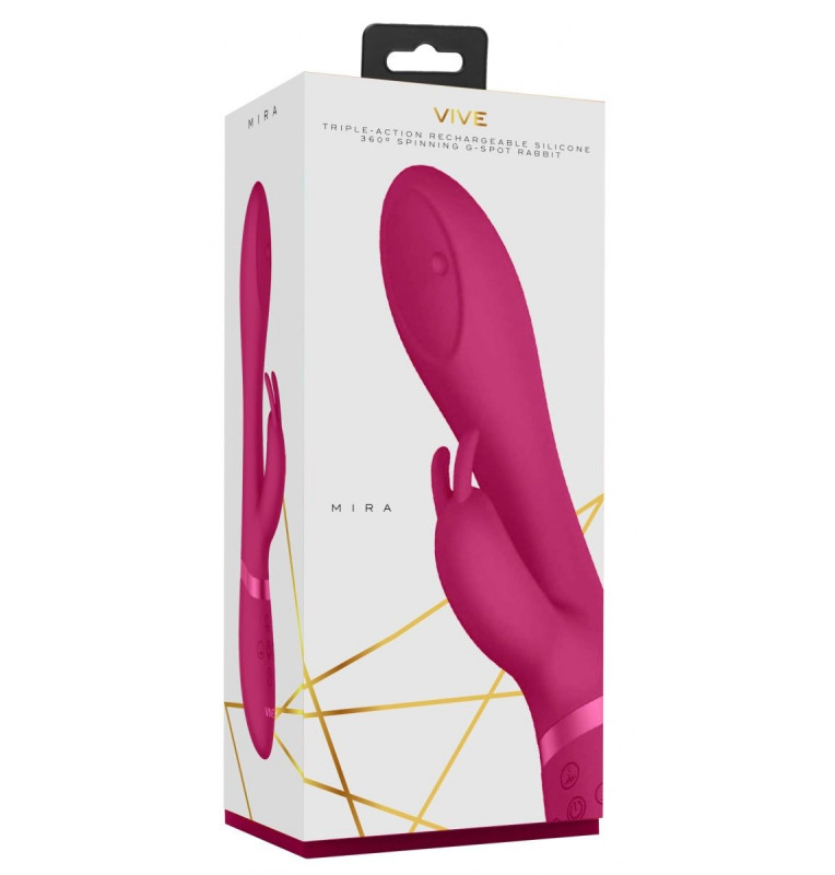 Mira – необычный вибромассажер-кролик с вращающимся шариком на вагинальном отростке. Он изготовлен из высококачественного, мягкого, нежного на ощупь 100% медицинского силикона с пылеотталкивающими свойствами и прочного, элегантного АБС-пластика. Вибромассажер оснащен инновационными электродвигателями нового поколения F1. Преимущество такого типа двигателя в том, что он делает интенсивную стимуляцию очень мягкой даже при мощном максимальном воздействии. Игрушка имеет три мощных отдельных мотора, каждый из которых обеспечивает 10 функций вибрации, способной достигать 8500 и 9000 оборотов в минуту. Это дает возможность настраивать более чем 1000 уникальных комбинаций. Вибромассажер имеет необыкновенную функцию «мгновенный оргазм», при которой нажатие одной кнопки возводит интенсивность вибрации к максимальной точке. Функция «мгновенный оргазм» дает возможность получения быстрого и/или очень сильного удовольствия. Вибромассажер подходит для вагинально-клиторальной стимуляции. Эргономичному дизайну, чуть увеличенной головку и специализированной бусинке, осуществляющей ротацию, игрушка идеальна для более целенаправленной стимуляции точки G. Вибромассажер полностью водонепроницаем, а это значит, что его можно смело использовать в ванной или душе. Вибромассажер заряжается через USB и может быть подключен практически в любом месте. Просто подсоедините идущий в комплекте шнур к совместимому порту компьютера или USB-адаптера (приобретается отдельно), а противоположный конец с магнитной зарядкой к игрушке. Полная зарядка занимает 180 минут, ее достаточно для беспрерывной работы до 60 минут. Рабочая длина - 11,5 см.