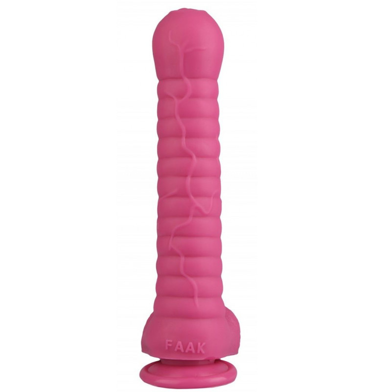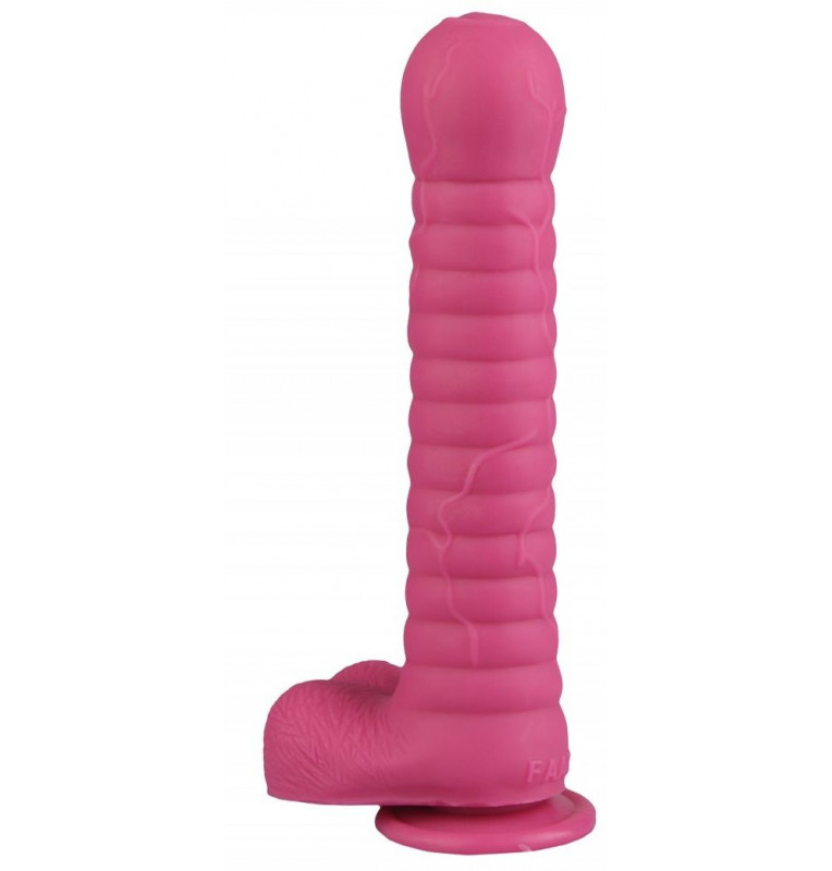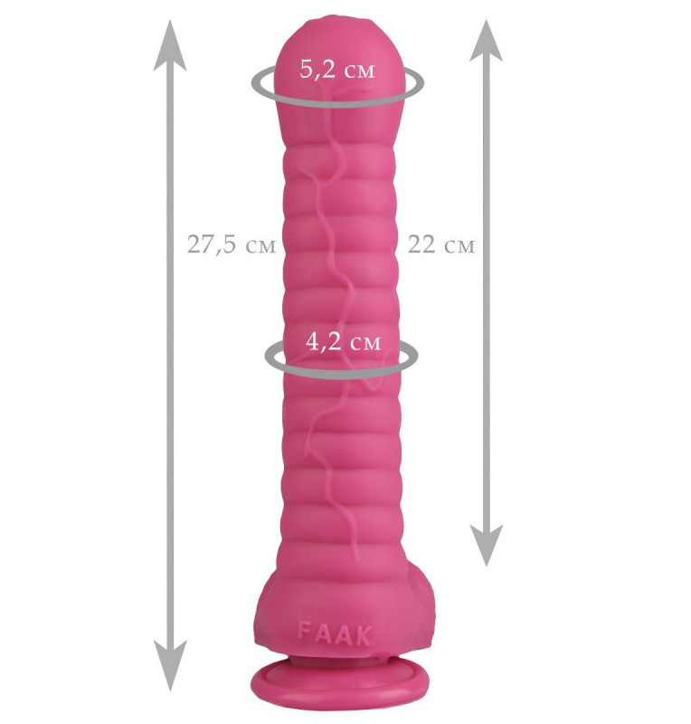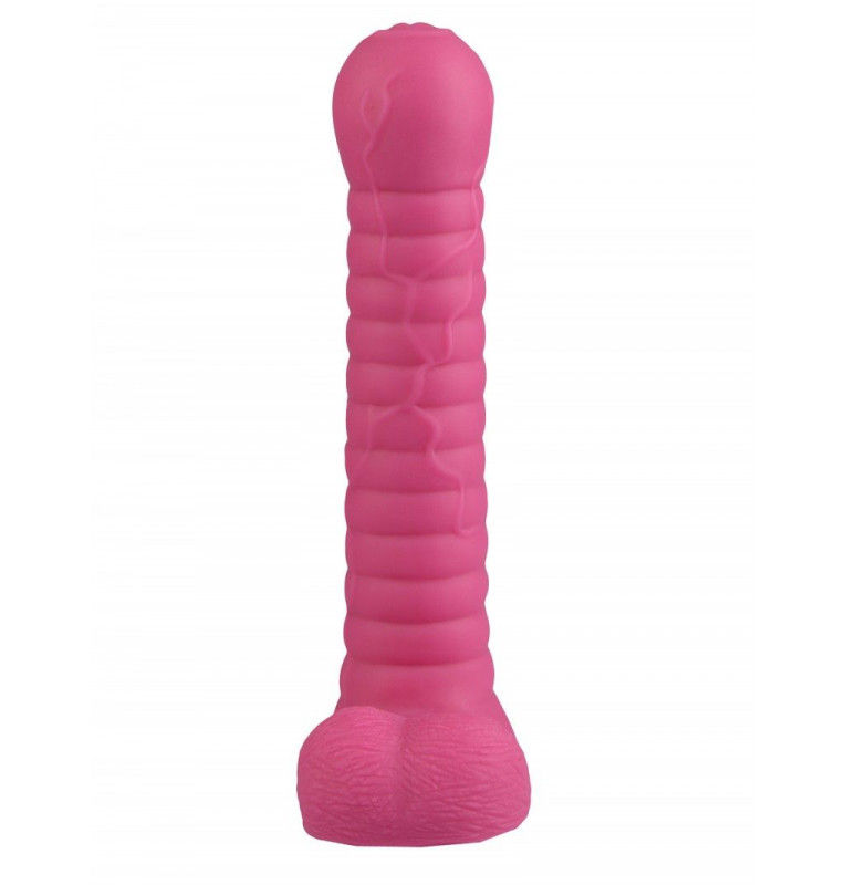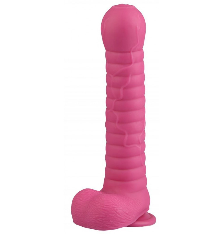 Розовый рельефный фаллоимитатор с мошонкой - 27,5 см.