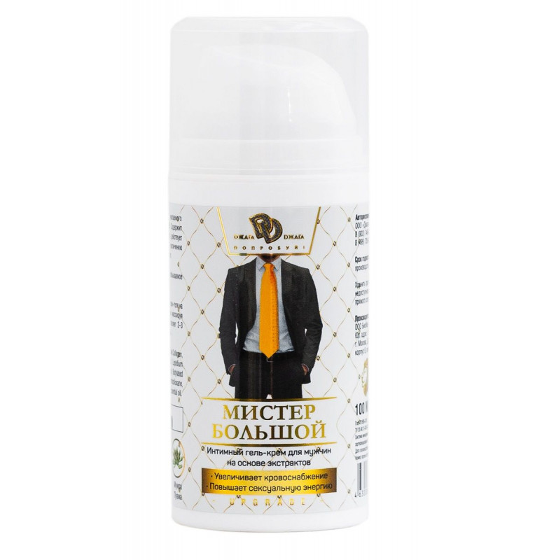 Большой размер имеет значение! Добиться желаемого результата позволит гель-крем МИСТЕР БОЛЬШОЙ. Содержит только натуральные компоненты. Легко наносится, действует мгновенно и продолжительно. Способствует увеличению размера, обеспечивает быстрый и устойчивый эффект. Разожгите большой огонь страсти и доставляйте незабываемое наслаждение