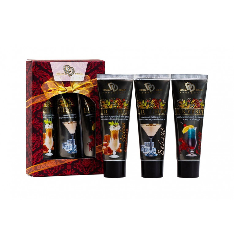 Подарочный набор состоит из трех сочных и ярких ароматизированных смазок: Juicy fruit с ароматом соленой карамели, Juicy fruit с ароматом бейлис, Juicy fruit с ароматом энергетика. Интимные лубриканты насыщенных ароматов подарят вам незабываемые впечатления оральных ласк. Продукты содержат только натуральные пищевые ароматизаторы. Абсолютно безопасны для орального потребления. В наборе 3 лубриканта по 30 мл. каждый.