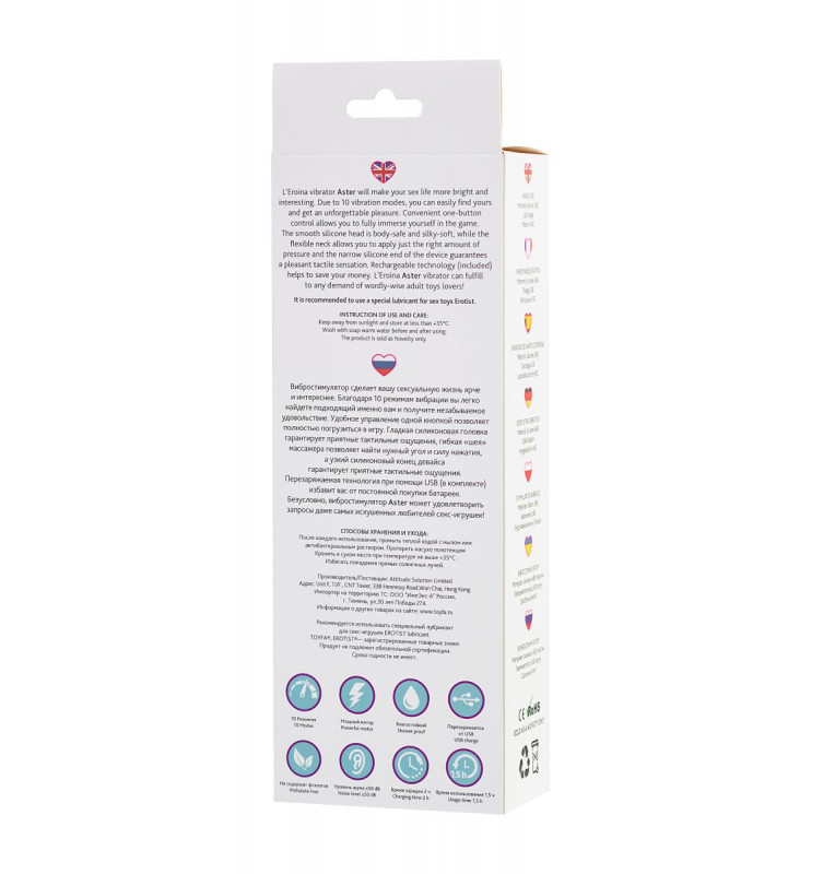 Вибростимулятор Aster сделает вашу сексуальную жизнь ярче и интереснее. Благодаря 10 режимам вибрации вы легко найдете подходящий именно вам и получите незабываемое удовольствие. Удобное управление одной кнопкой позволяет полностью погрузиться в игру. Гладкая силиконовая головка гарантирует приятные тактильные ощущения, гибкая шея массажера позволяет найти нужный угол и силу нажатия, а узкий силиконовый конец девайса гарантирует приятные тактильные ощущения. Перезаряжаемая технология при помощи USB (в комплекте) избавит вас от постоянной покупки батареек. Безусловно, вибростимулятор Aster может удовлетворить запросы даже самых искушенных любителей секс-игрушек! Минимальный диаметр - 1,9 см.