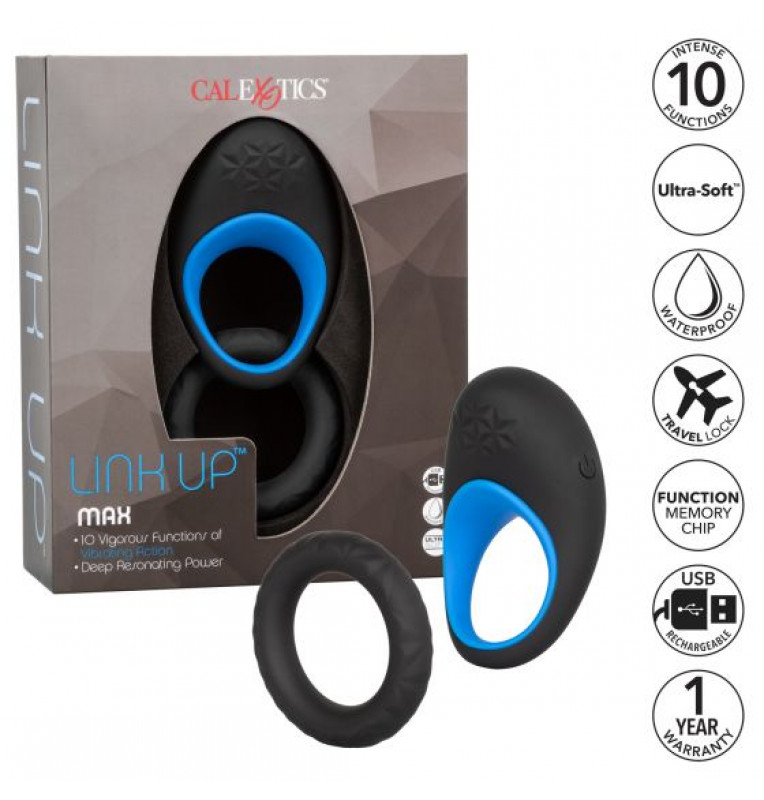 Набор эрекционных колец Link Up Max – двойное стимулирующее кольцо доставляет интенсивное удовольствие с 10 мощными функциями вибрации, дополнительным поддерживающим кольцом Ultra-Soft и дразнящей ребристой текстурой. Оно изготовлено из гладкого, шелковистого на ощупь, безопасного для здоровья медицинского силикона. Кольцо препятствует оттоку крови для поддержания эрекции и замедляя процесс эякуляции. Оно имеет уникальную ребристую форму обеспечивающую дополнительную стимуляцию клитора или яичек во время полового акта. Бархатистая поверхность обеспечит максимально нежные тактильные ощущения. Управление осуществляется с помощью всего одной кнопки в головке. Для переключения скорости достаточно всего одного нажатия. Кольцо заряжается через специальный аккумуляторный USB кабель и может быть подключено практически в любом месте. Просто подсоедините идущий в комплекте шнур к изделию и совместимому порту компьютера или USB-адаптера (приобретается отдельно). Полная зарядка занимает 2,5 часа, ее достаточно для беспрерывной работы до 1,5 часа высокоинтенсивной вибрации. Внутренний диаметр колец - 3,75 см.