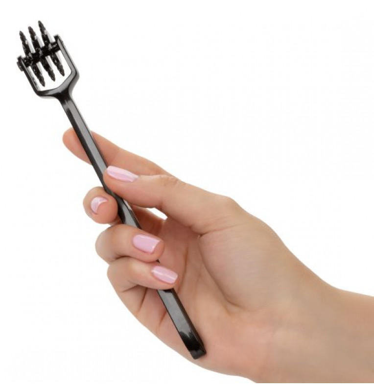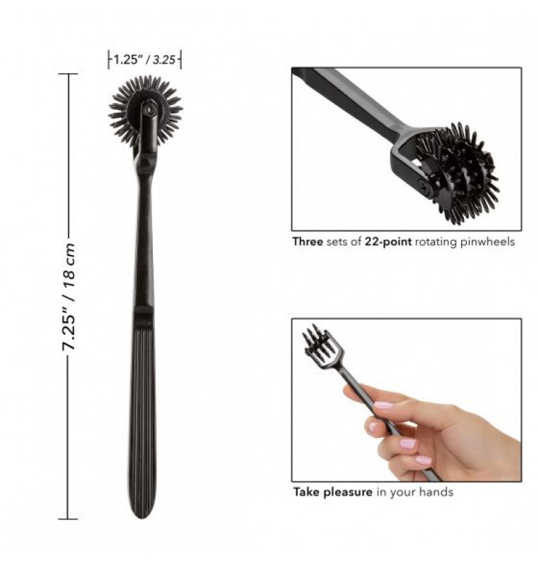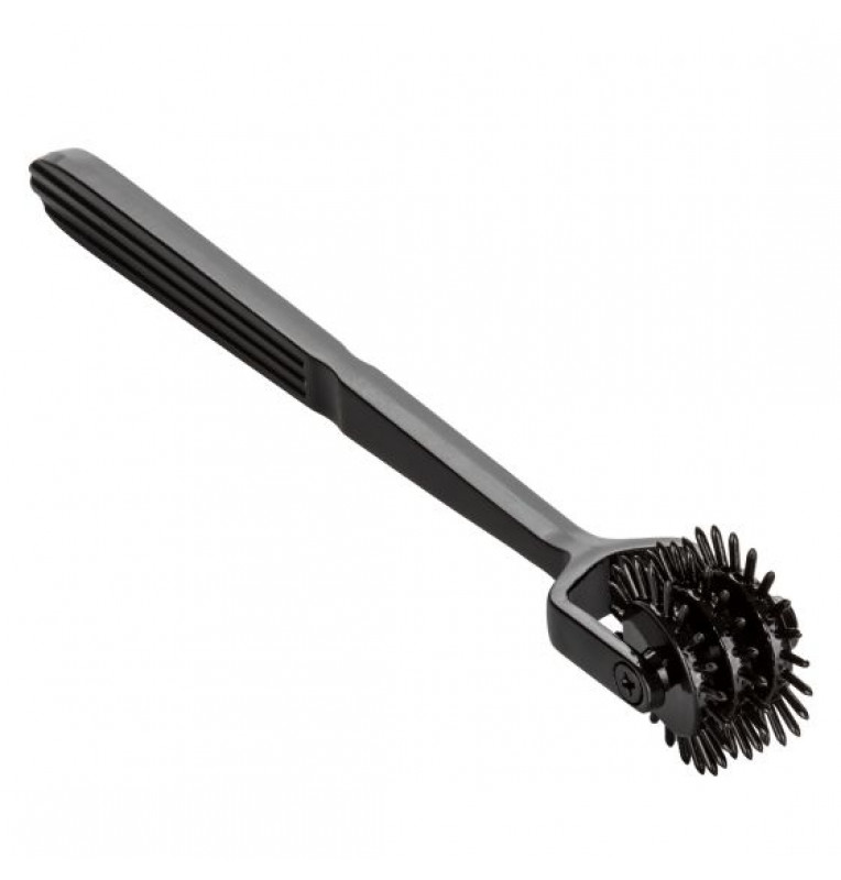 Колесо Вартенберга Scandal Trio Pleasure Wheel – аксессуар для эротических ролевых игр и БДСМ-практик. Представляет собой три массажных колесика, на которых располагаются 22 тонких шипа средней длины. Шипы обеспечивают покалывающие ощущения, которые напоминают легкие уколы иголки, касающейся кожи. Аксессуар изготовлен из сверхпрочного, не тускнеющего сплава.