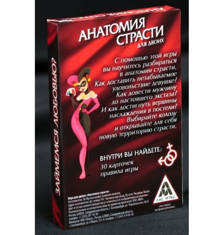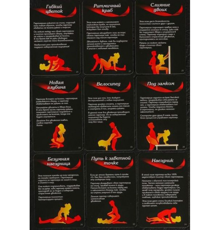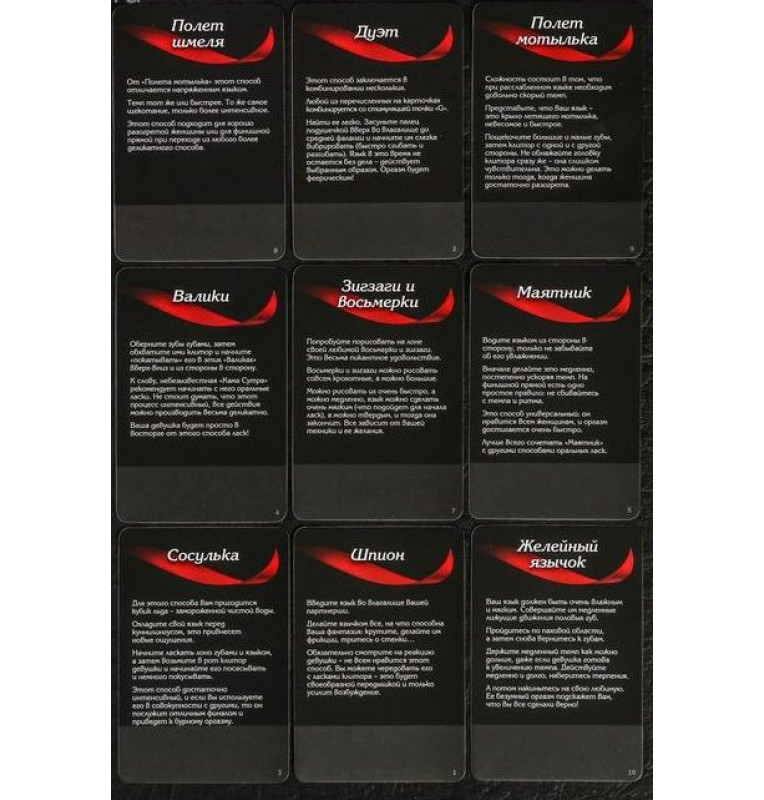 Как доставить незабываемое удовольствие девушке? Как довести мужчину до настоящего экстаза? Как достигнуть вершины наслаждения? Выбирайте колоду и открывайте для себя новую территорию страсти! Воплощайте самые смелые фантазии. Внутри вы найдёте карточки трёх видов: «Наслаждение для неё», «Наслаждение для него» и «Наслаждение для двоих». Спрячьте телефоны и настройтесь на романтический лад: включите расслабляющую музыку и наполните комнату чувственными ароматами — ничего не должно омрачать ваше настроение сегодня. Выбирайте любую карточку, выполняйте действия, написанные на ней, и доставляйте друг другу незабываемое удовольствие! В комплекте: 30 карточек, правила игры.
