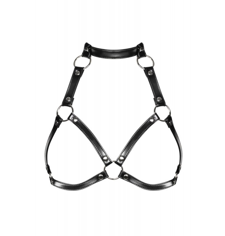 Портупея в виде бюстгальтера. Изготовлена из прочного материала, имитирующего кожу и металла. Прочные ремешки соединяются между собой при помощи колец. На шее и спине регулировка по длине. Металлические заклепки украшают портупею.