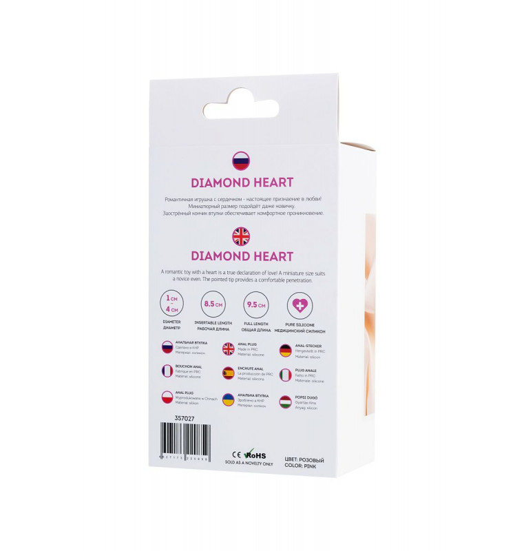 Анальная втулка Diamond Heart. Романтичная игрушка с сердечком - настоящее признание в любви! Средний размер подойдёт как новичкам, так и опытным любителям. Заострённый кончик втулки обеспечивает комфортное проникновение. Рабочая длина - 8,5 см. Минимальный диаметр - 1 см.