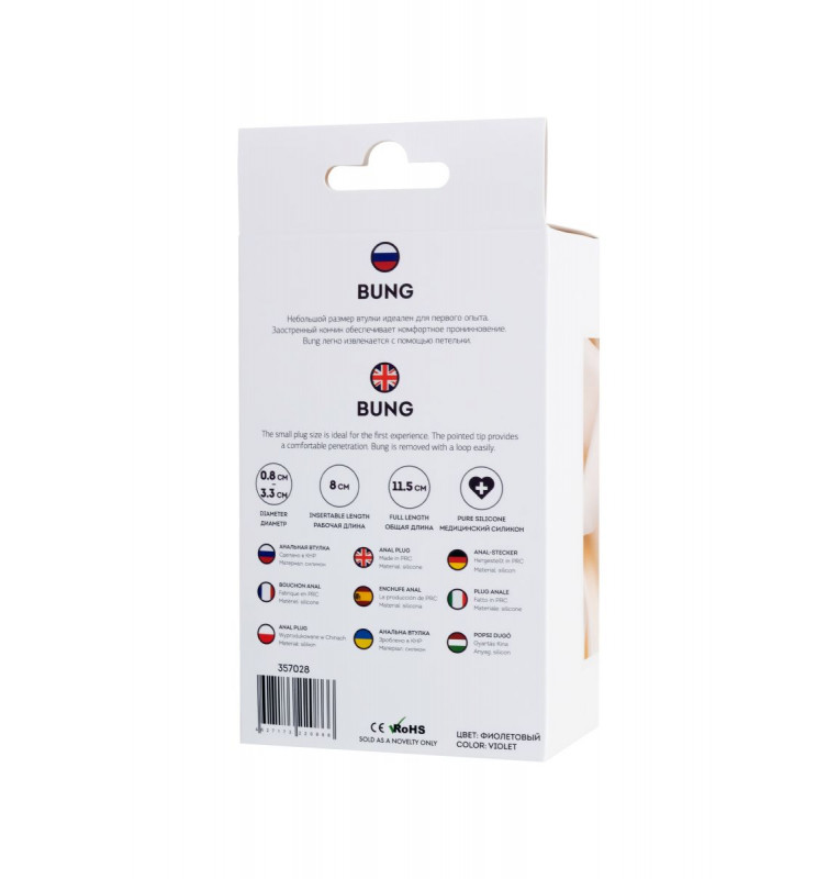 Анальная втулка Bung. Небольшой размер втулки идеален для первого опыта. Заостренный кончик обеспечивает комфортное проникновение. Bung легко извлекается с помощью петельки. Рабочая длина - 8 см. Минимальный диаметр - 0,8 см.