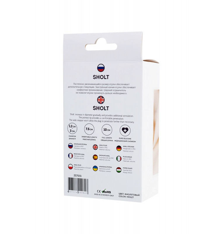 Анальная втулка Sholt. Постепенно увеличивающийся размер втулки обеспечивает дополнительную стимуляцию. Заострённый кончик втулки обеспечивает комфортное проникновение. Широкий ограничитель не позволит втулке проникнуть дальше необходимого. Рабочая длина - 7,5 см. Минимальный диаметр - 1,2 см.