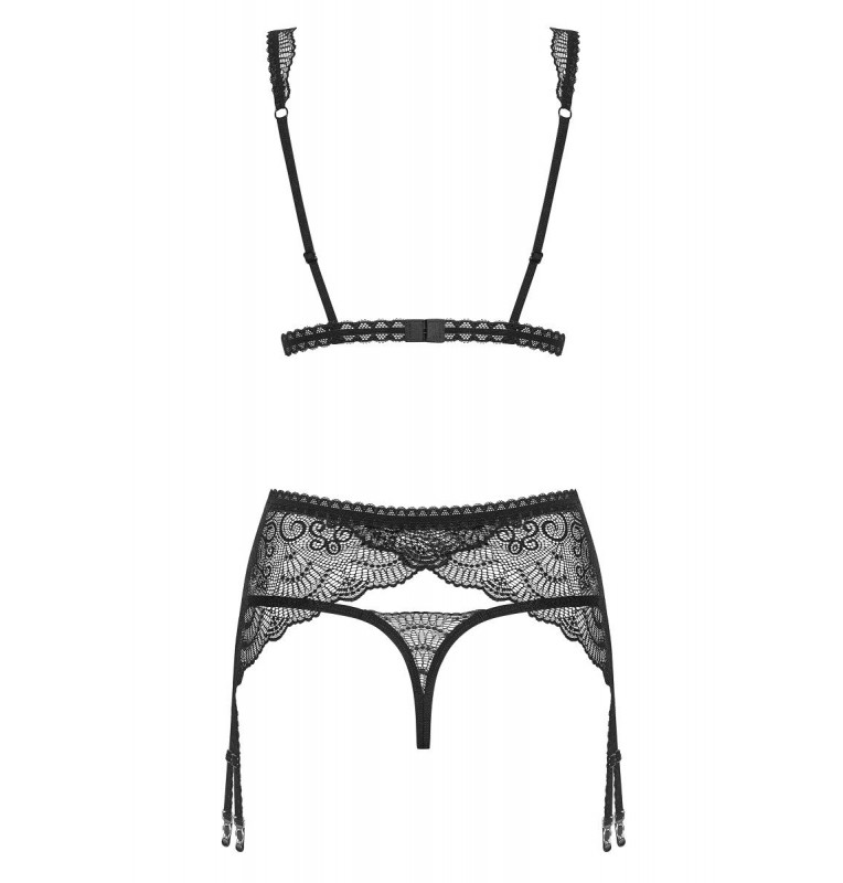 Роскошный кружевной комплект нижнего белья Firella состоит из бюстгальтера, стрингов и пояса для чулок. Бюстгальтер с мягкими чашками без косточек, застегивается на крючки-петли. Бретели и пажи регулируются по длине. В комплекте: бюстгальтер, трусики-стринги, пояс для чулок.