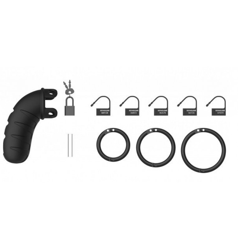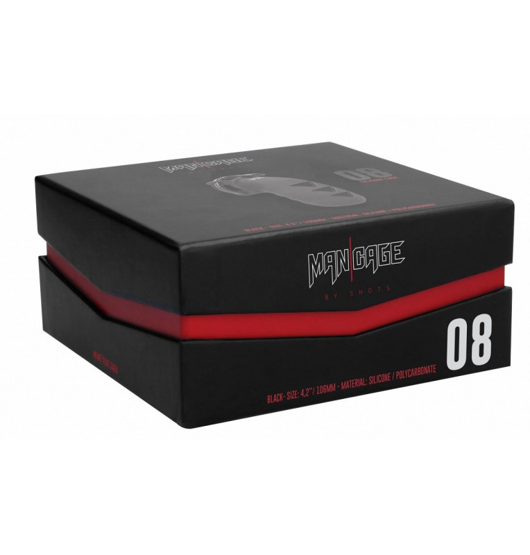 Cock Cage Model 08 Chastity - 4.2 – специализированное приспособление для мужчин, предназначенное для предотвращения эрекции, полового акта или мастурбации. В комплект входит железный замок и тонкая гибкая лента высокой прочности. Благодаря легкому, прочному и гипоаллергенному материалу пояс идеально подходит для долговременного ношения. Изделие состоит из нескольких разборных частей: клетки, кольца и штифтов, которые идеально сочетаются друг с другом. В комплекте к поясу идет 3 кольца разных диаметров для разных размеров и предпочтений. Просто выберете подходящий размер кольца, соедините его тремя штифтами, оденьте на средний штифт специальную втулку и соедините с клеткой. На центральном штифте есть специальное отверстие для замка. Выберете один из замков и зафиксируйте пояс. Фиксация тонкой гибкой лентой высокой прочности гарантирует, что металлоискатели на пояс не среагируют. Для поддержания надлежащей гигиены устройство снабжено вентиляционными отверстиями и отверстием для мочеиспускания. Диаметр колец - 4, 5, 6 см.
