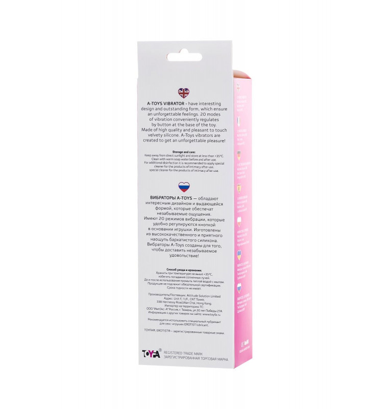 Вибратор A-Toys обладает интересным дизайном и выдающейся формой, которые обеспечат незабываемые ощущения. Имеют 20 режимов вибрации, которые удобно регулируются кнопкой в основании игрушки. Изготовлены из высококачественного и приятного на ощупь бархатистого силикона. Вибратор A-Toys созданы для того, чтобы доставить незабываемое удовольствие! Рабочая длина - 14 см. Минимальный диаметр - 2.4 см.