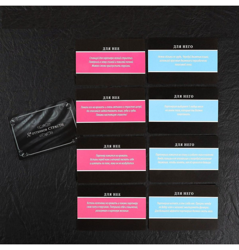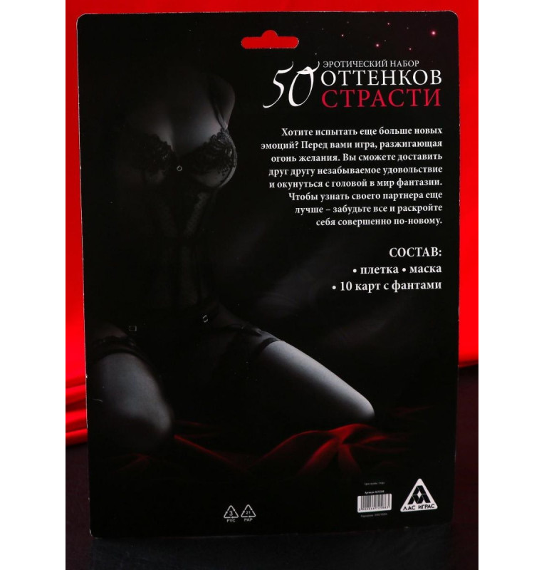 Испытайте на себе 50 оттенков страсти! Хотите испытать ещё больше новых эмоций? Перед вами игра, которая разжигает огонь желания. Вы сможете доставить друг другу незабываемое удовольствие и окунуться с головой в мир фантазий. Что нужно делать?Внутри вас ждут 10 карточек c фантами — для него и для неё. По очереди вытягивайте карточки и выполняйте то, что на них написано. А плётка и маска добавят пикантности вашей игре. В комплекте: маска, плетка,10 карт-фант.