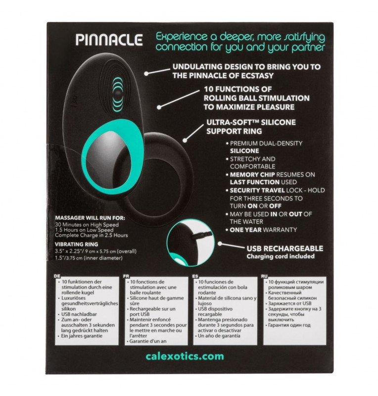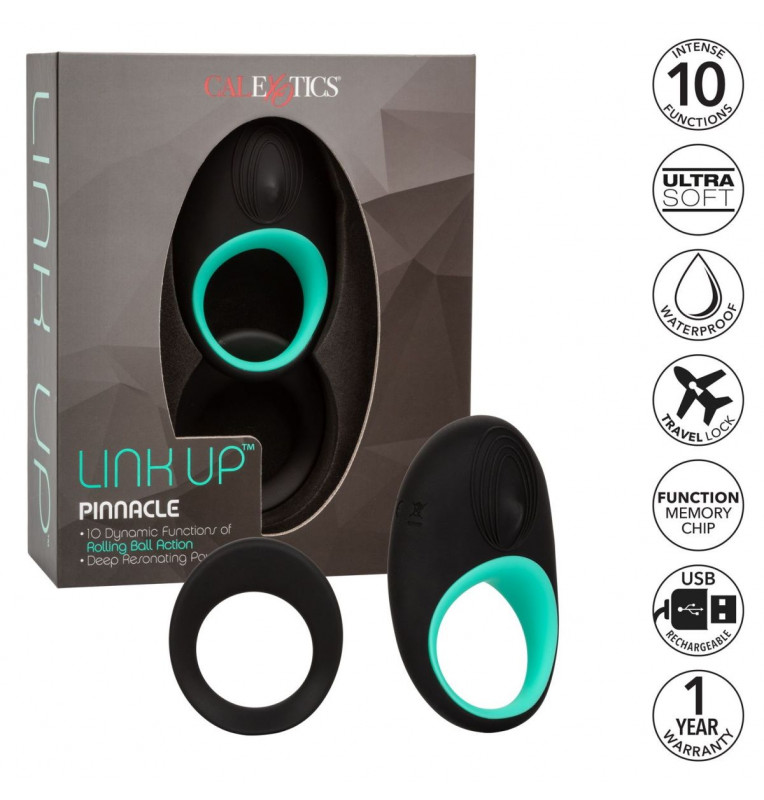 Набор эрекционных колец Link Up Pinnacle – двойное стимулирующее кольцо доставляет интенсивное удовольствие с 10 мощными функциями вибрации и движением мини язычка на стимуляторе, дополнительным поддерживающим кольцом Ultra-Soft и дразнящей ребристой текстурой. Оно изготовлено из гладкого, шелковистого на ощупь, безопасного для здоровья медицинского силикона. Кольцо препятствует оттоку крови для поддержания эрекции и замедляя процесс эякуляции. Оно имеет уникальную ребристую форму обеспечивающую дополнительную стимуляцию клитора или яичек во время полового акта. Бархатистая поверхность обеспечит максимально нежные тактильные ощущения. Управление осуществляется с помощью всего одной кнопки в головке. Для переключения скорости достаточно всего одного нажатия. Кольцо заряжается через специальный аккумуляторный USB-кабель и может быть подключено практически в любом месте. Просто подсоедините идущий в комплекте шнур к изделию и совместимому порту компьютера или USB-адаптера (приобретается отдельно). Полная зарядка занимает 2,5 часа, ее достаточно для беспрерывной работы до 1,5 часа высокоинтенсивной вибрации. Длина виброкольца - 9 см., диаметр - 3,75 см. Диаметр эрекционного кольца - 3,75 см.