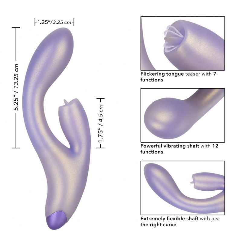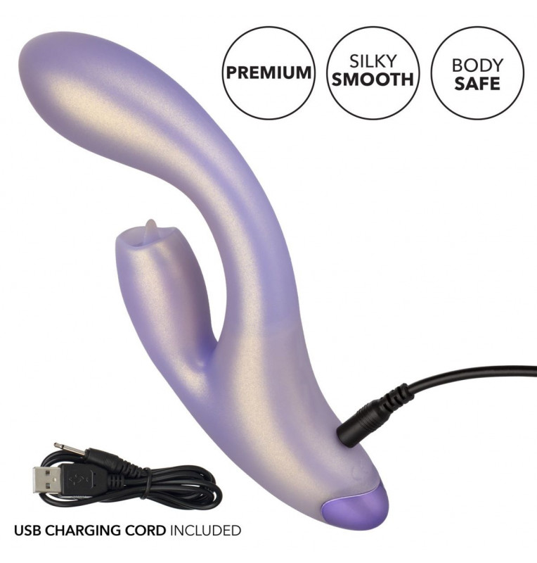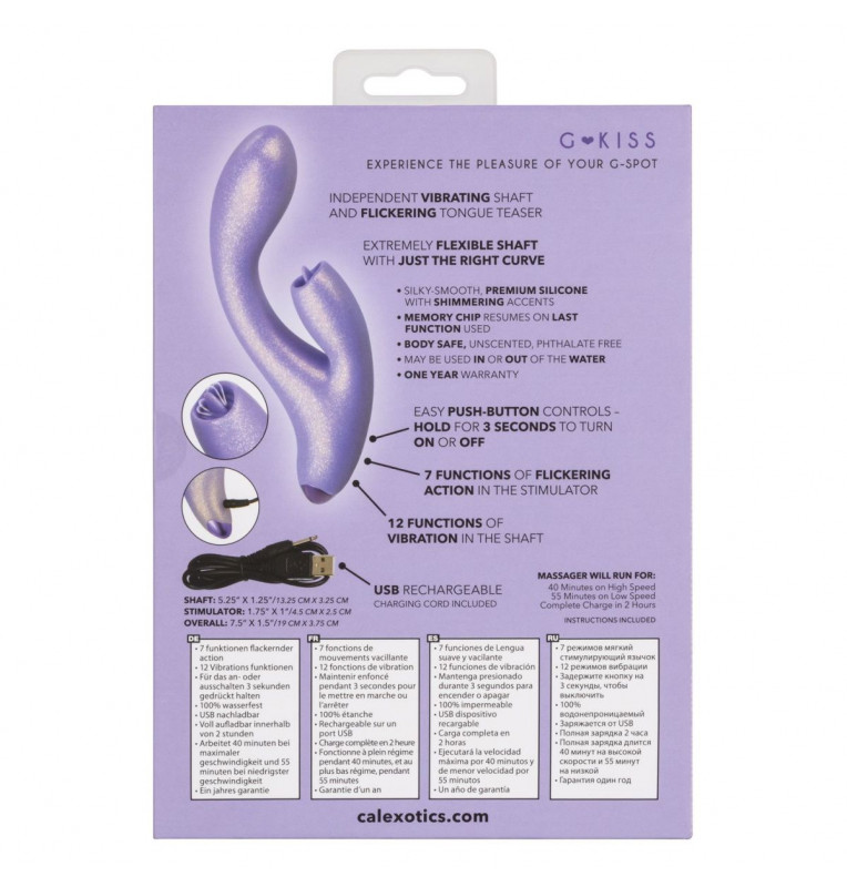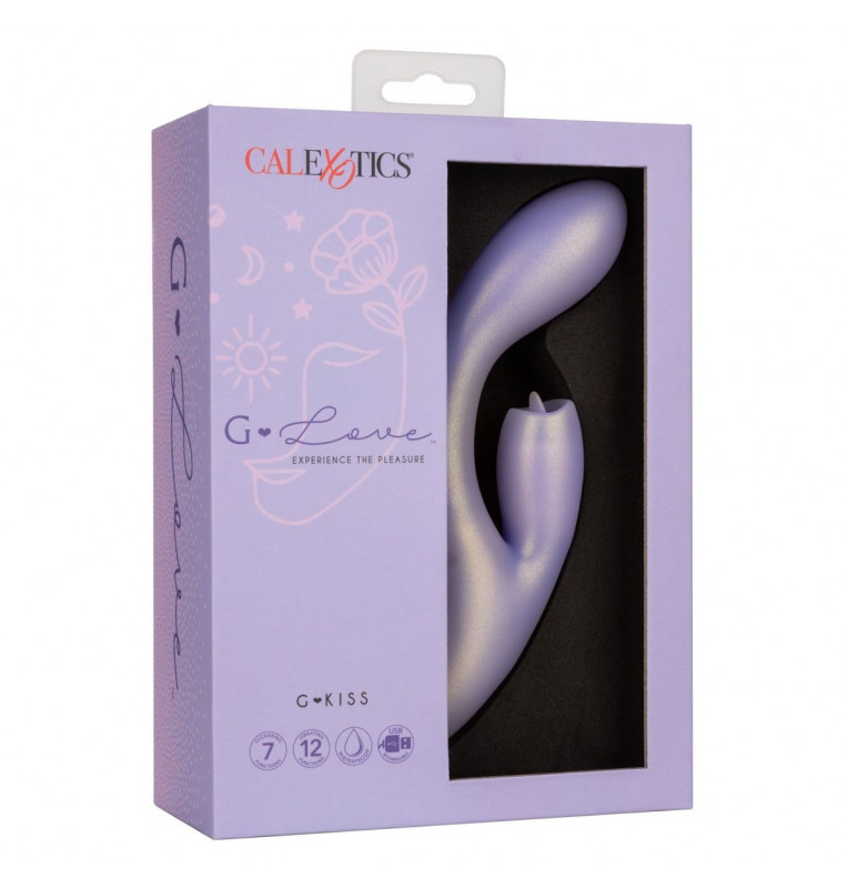 G-Love GKiss – двойной стимулирующий массажер с мерцающим язычком на клиторальном отростке. Вибратор кролик выполнен из 100% качественного силикона, основной ствол имеет 12 функций вибрации, в то время как клиторальный язычок двигается в 7 различных вариантах. Изгиб основного ствола отлично стимулирует точку G, а клиторальный отросток прекрасно симулирует оральные ласки. Управление осуществляется с помощью 3 кнопок в основании. Чтобы включить или выключить стимулятор, необходимо нажать и в течение трех секунд удерживать верхнюю кнопку питания. Вибромассажер заряжается через USB и может быть подключен практически в любом месте, просто подсоедините идущий в комплекте шнур к совместимому порту компьютера или USB-адаптера (приобретается отдельно), а противоположный конец к разъему у основания. Полная зарядка занимает 120 минут, ее достаточно для беспрерывной работы в течение 55 минут. Рабочая длина - 13,75 см. Длина клиторального отростка - 4,5 см., диаметр - 2,5 см.