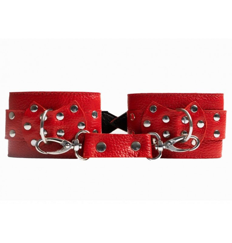 Наручники выполнены из натуральной кожи, текстурированные. Декорированы заклепками и бантом с металлическим кольцом. Несмотря на брутальность, смотрятся на теле очень эффектно и сексуально. Наручники надежно фиксируются пряжками и ремнями, позволяющими выбрать нужный размер. Внутренняя подкладка мягкая, контрастного цвета. Она не доставит неприятных ощущений, благодаря тому, что вся металлическая фурнитура спрятана за ней. Кожаное соединение на карабинах фиксирует наручники вместе. Аксессуар позволяет в полной мере насладиться сексом в стиле БДСМ. Ширина наручников - 6 см., ремешка - 3 см. Обхват - 25 см.