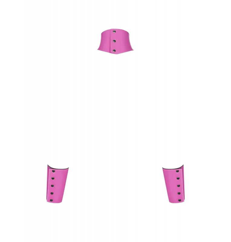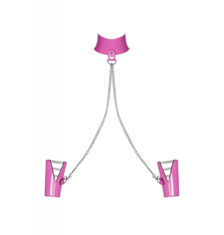 Наручники и чокер для эротических игр Lollypopy выполнены из эластичного материала имитирующего кожу, соединены между собой съемной серебристой цепочкой, дополнены застежкой на кнопки для удобства в применении.