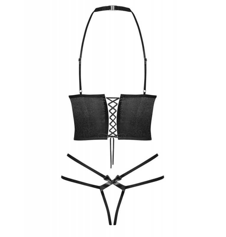Озорной комплект нижнего белья Delishya состоит из бюстгальтера-топа на шнуровке и трусиков. Бюстгальтер с чашками на косточках и тонком поддерживающем поролоне, на спинке застежка в виде шнуровки, дополнен несъемным чокером. Комплект декорирован атласными бантиками. В комплекте: бюстгальтер-топ, трусики.
