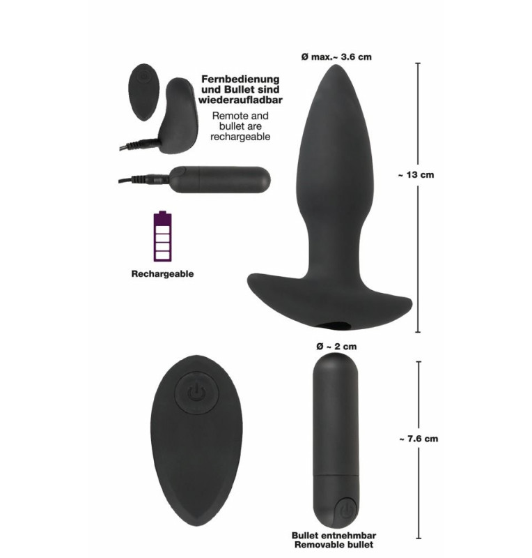 Анальная пробка небольшого диаметра и идеально подходит для начинающих, которые хотят расширить свой кругозор. Мягкая поверхность позволяет легко вставить пробку внутрь, а стопор в форме якоря предотвращает ее скольжение слишком далеко. 10 режимами вибрации можно легко управлять с помощью пульта дистанционного управления. Пуля съемная и ее можно использовать по-разному во время занятий любовью. Пульт дистанционного управления и пулю можно легко перезарядить с помощью прилагаемого USB-кабеля. Рабочая длина - 10 см. Длина вибропули - 7,6 см., диаметр - 2 см.