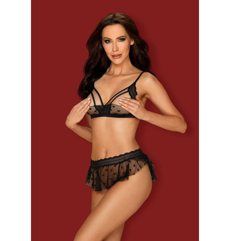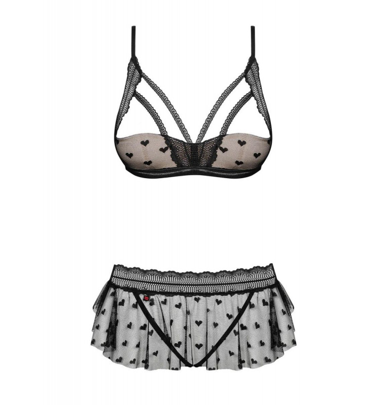 Озорной комплект белья из полупрозрачного тюля с узором в сердечки. Бра с открытыми чашечками и бежевым подкладом поддерживает грудь. Декоративные тесемки в два ряда и кружево по бокам привлекают внимание к зоне декольте. Бретели с металлической фурнитурой регулируются по длине, сзади застежка на несколько рядов крючков для наилучшей посадки изделия по фигуре. Откровенные трусики с доступом изготовлены из тонких эластичные лент. Кружево на бедрах и игривая оборка подчеркивают бедра и выделяют ягодицы. В комплекте: бра, трусики.