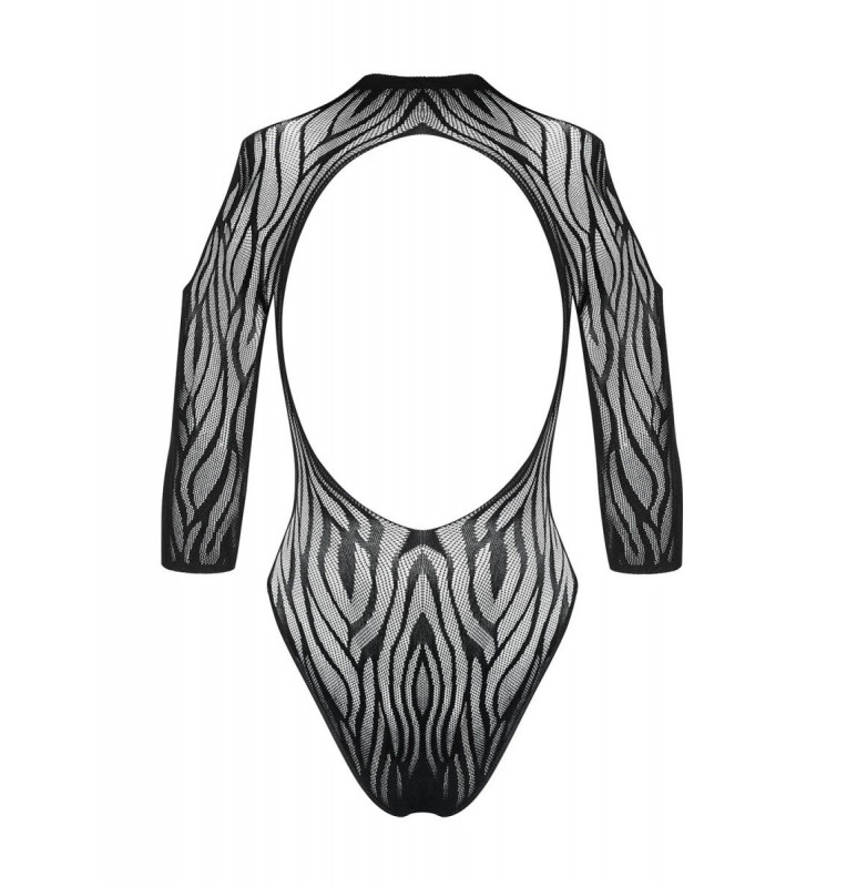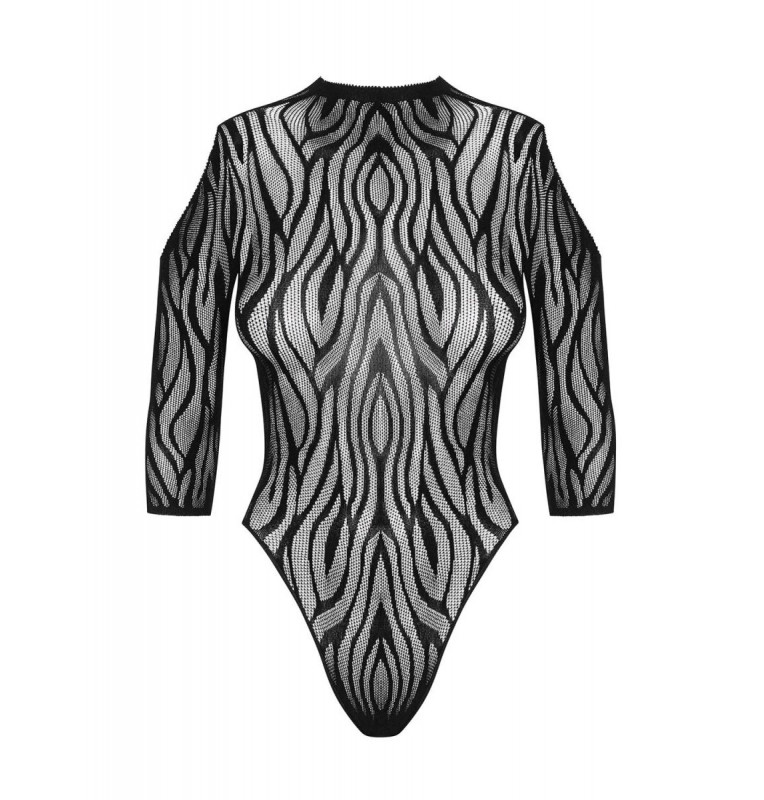 Смелое боди с узором зебра. Выполнено цельным плетением из эластичной ткани и прекрасно садится по фигуре. Модель с рукавами 3/4 и пикантными вырезами на плечах. На спине красуется чувственный вырез. Боди подчеркивает бедра и ягодицы, благодаря оригинальному крою.