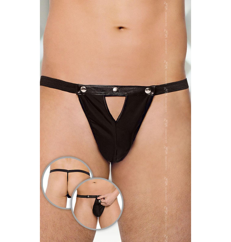 Мужские трусики-стринги из плотной ткани. Спереди, в верхней части, декоративный треугольный вырез. Треугольник ткани фиксируется на поясе с помощью заклёпок: можно в любой момент отстегнуть переднюю часть стрингов так, что спереди останется только резинка. Это отличный выбор как для повседневной носки, так и для эротических игр или романтического вечера с любимой. Смелые стринги демонстрируют вожделенный объем вашей плоти, заставляя женщину почувствовать мощную волну возбуждения. Усилят желание и упругие ягодицы, которые в стрингах просто великолепны.