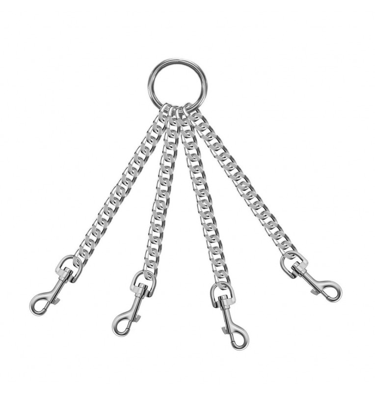 Четыре цепи с карабинами на кольце. Может использоваться для соединения наручей, поножей, также ошейника с наручами, поножами и т.д. Рабочая длина одной цепочки - 15 см. Длина карабина - 5,5 см. Диаметр кольца - 4,8 см., толщина - 0,5 см.