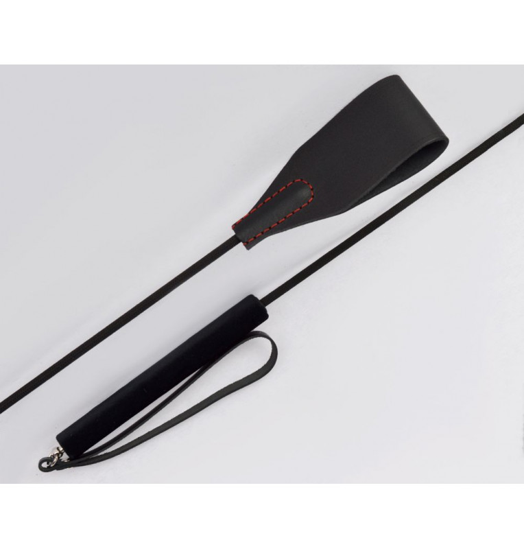 Стек состоит из жесткой рукояти, гибкого полимерного хлыста и хлопушки из натуральной кожи. Декорирован контрастной строчкой.