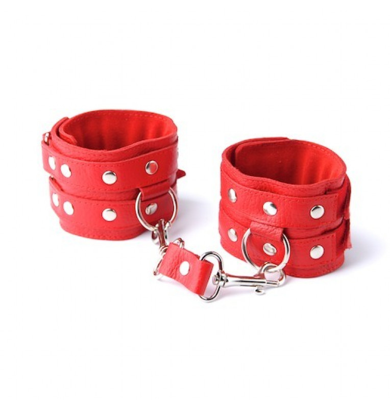 Изготовлены из натуральной кожи с велюровой подкладкой. При изготовлении использована фурнитура с никелевым покрытием. Между слоем основы и подкладкой проложена мягкая прокладка. Соединяются между собой коротким ремешком с двумя карабинами на концах. Не нарушают кровообращение, надёжно фиксируются на запястьях с помощью двух ремешков на липучке . Размер универсальный.
