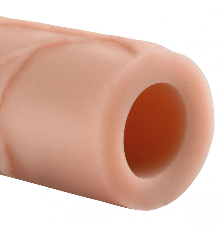 Реалистичная насадка с выделяющимися венами, складками, ярко выраженной головкой. Изготовлена из супер-эластичного Fanta Flesh материала. Материал не содержит фталатов. Подходит для большинства размеров. Увеличивает диаметр (даёт в среднем 33% увеличения в диаметре от исходных параметров) и увеличивает длину на 2,5 см. Легко обрезается у основания для идеальной подгонки под индивидуальные параметры. Может использоваться как мастурбатор. Внутренний диаметр - 2,5 см. Прирост длины - 2,5 см.