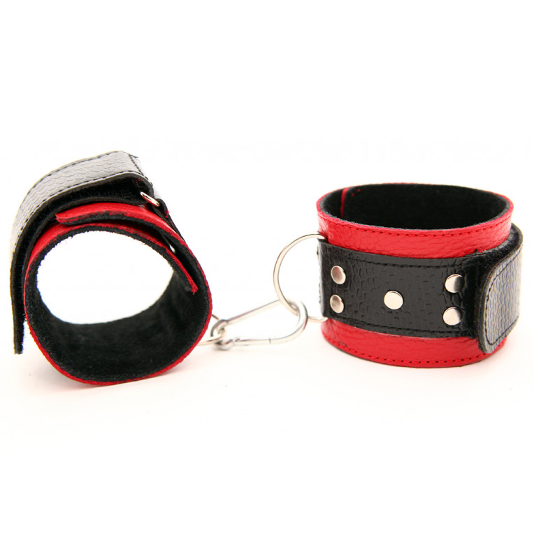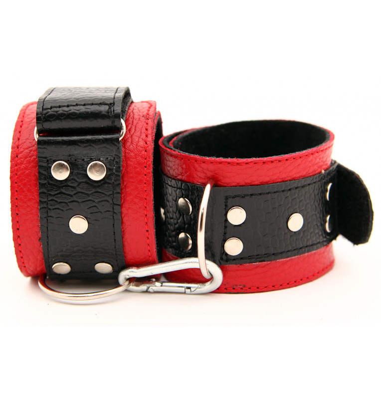 Кожаные наручники в красно-черной гамме. Украшены заклепками и соединяются между собой цепью с карабинами. Размер наручников регулируется при помощи застежки-липучки. Ширина - 5 см. Длина цепочки - 15,5 см.