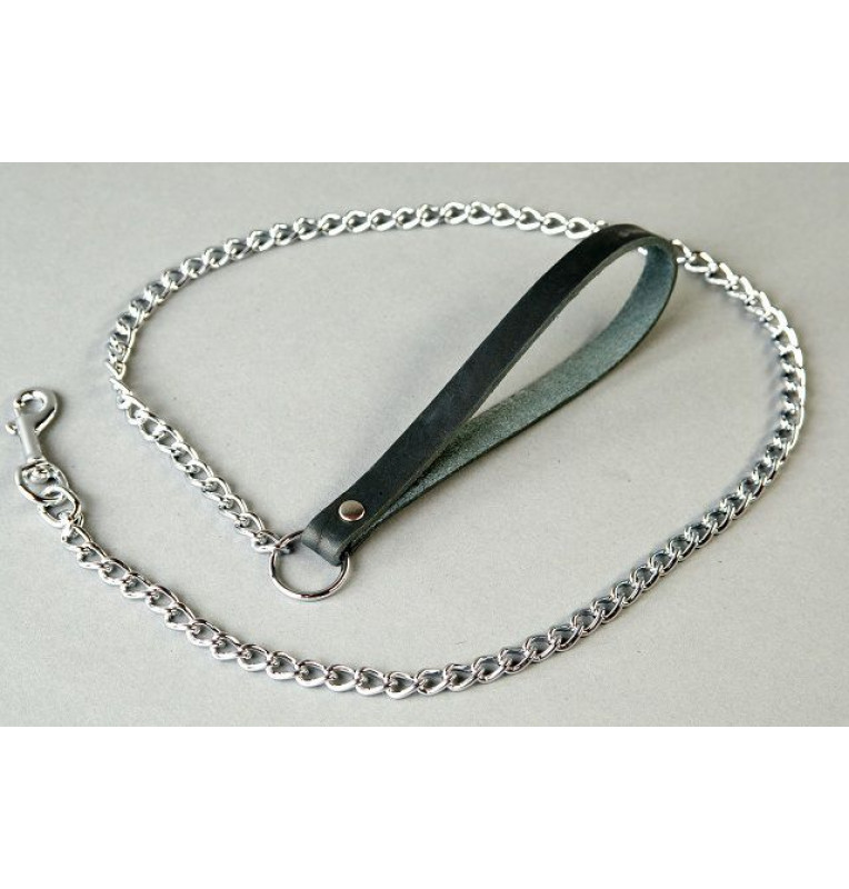 Металлический поводок на кожаной ручке. Может использоваться вместе с ошейником, наручами, поножами, всевозможными сбруями и т.д. Поводок снабжён удобной для захвата кожаной ручкой. Длина цепи - 80 см.