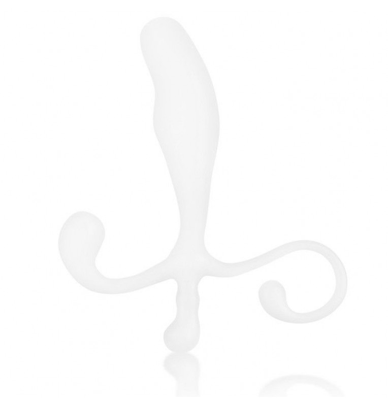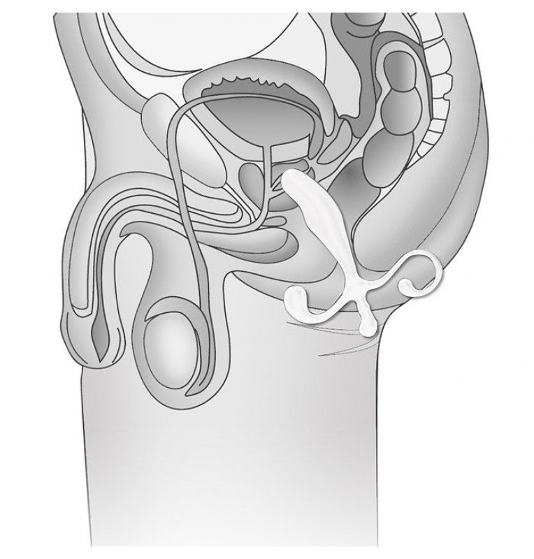Массажер простаты из качественного пластика белого цвета. Массажер имеет дополнительный стимулятор для внешнего массажа промежности. Таким образом обеспечивается одновременная стимуляция простаты: внутренняя и внешняя. Массаж может производиться как за счет сокращений собственных мышц, так и с помощью воздействия на рукоятку массажера. Игрушка водонепроницаема и гипоаллергенна. Рабочая длина - 9 см.