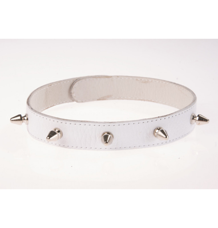Изготовлен из натуральной кожи с велюровой подкладой. При изготовлении использована никелированная фурнитура. Размер универсальный, регулируется при помощи кнопок. Один из основных атрибутов BDSM. Ширина - 2 см. Длина шипов - 1,2 см.